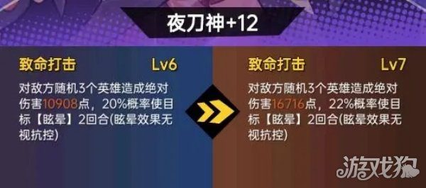 技能效果随机三个目标20%概率使其眩晕,持续两回合(随着提升等级伤害、概率和锁定目标数量会增加,并产生额外伤害BUFF)。