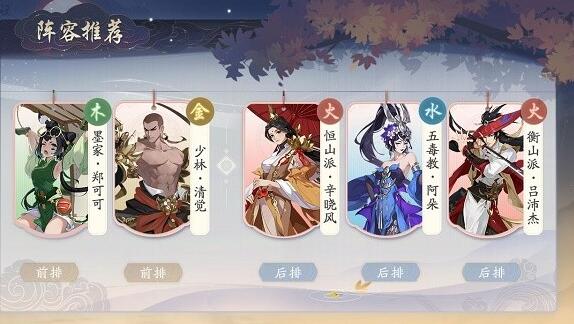 墨家+少林打前排,恒山、五毒、衡山派打后排,这套阵容是攻防体系,输出全面,防御增益效果也比较强悍。少林具有群体护盾,辛晓风可以给群体减伤,可以帮助吕沛杰进场,然后对敌方的后排C位大侠进行树池,同时能够激活金、木、水、火势力阵营各一名侠客 的羁绊,增加10%攻击力和15%生命值。
