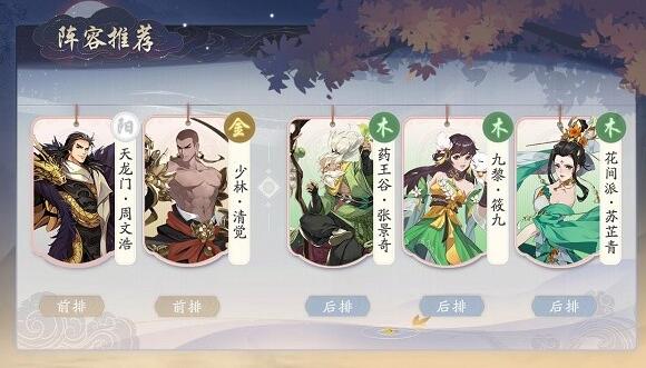 阵容一:天龙(阳)+少林(金)+药王(木)+九黎(木)+花间(木)。