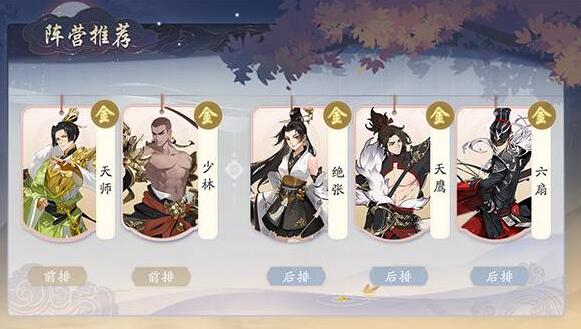 少林(前排主养)+嵩山(后排主养)+花间、药王(强力辅助)。再搭配一个额外输出,纯阳、华山、绝张均可,也可视情况更换为九黎、五毒等人气C位。