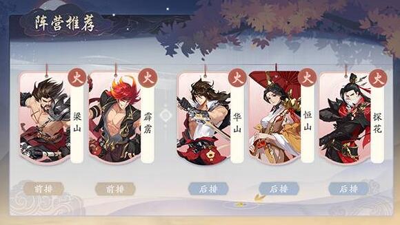 2、火势力的强力阵容,恒山能够为队伍侠客提供高额的伤害减免,提升队伍整体的硬度,而梁山、霹雳都是火系大侠里“能扛能打”的典范,在自身硬度足够的同时还有高额的输出伤害,配合恒山战斗力和坦度都拉满,再加上华山、探花的高额爆发能力,能够短时间内集火瞬秒敌方后排,融化敌方C位,同时也很难第一时间被秒,输出类型也是多样化的,让敌人防不胜防。